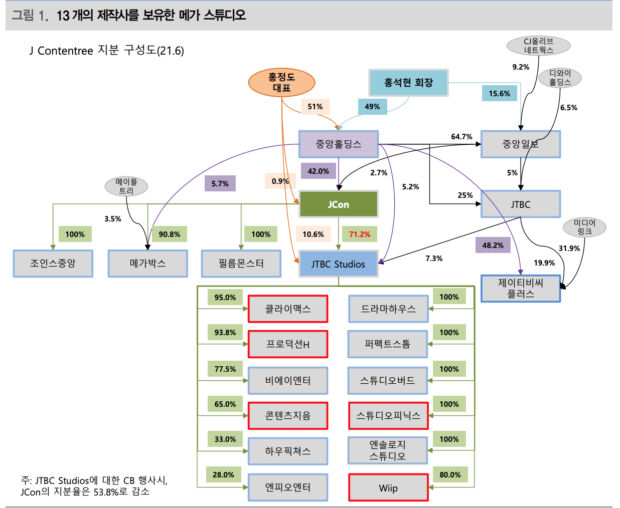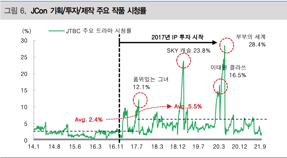 - JCon의 성장기: 1단계, 12~16년. JTBC 위주. 2단계, 17~19년, JTBC 위주이 지만, IP 확보. 3단계, 20.5월~, 넷플릭스 동시방영 및 오리지널 등장. 4단계, 21.11월 디즈니+의 한국 진출에 따라 글로벌향 컨텐츠 확대. 5단계: 미국에서 인수한 제작사 Wiip 통해 본격적으로 미국 시장 진출