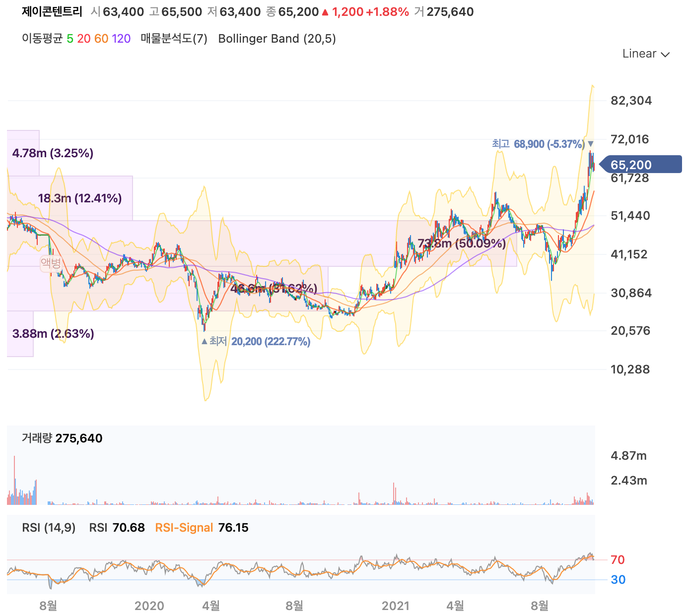 제이콘텐트리 주가는 볼린저밴드 중상단에 위치하면서 65,200원(2021/10/26)을 기록하고 있는데 이는 제이콘텐트리 주가의 2021년 전고점 68,900원(2021/10/20) 대비 5.67% 내려온 주가이다.