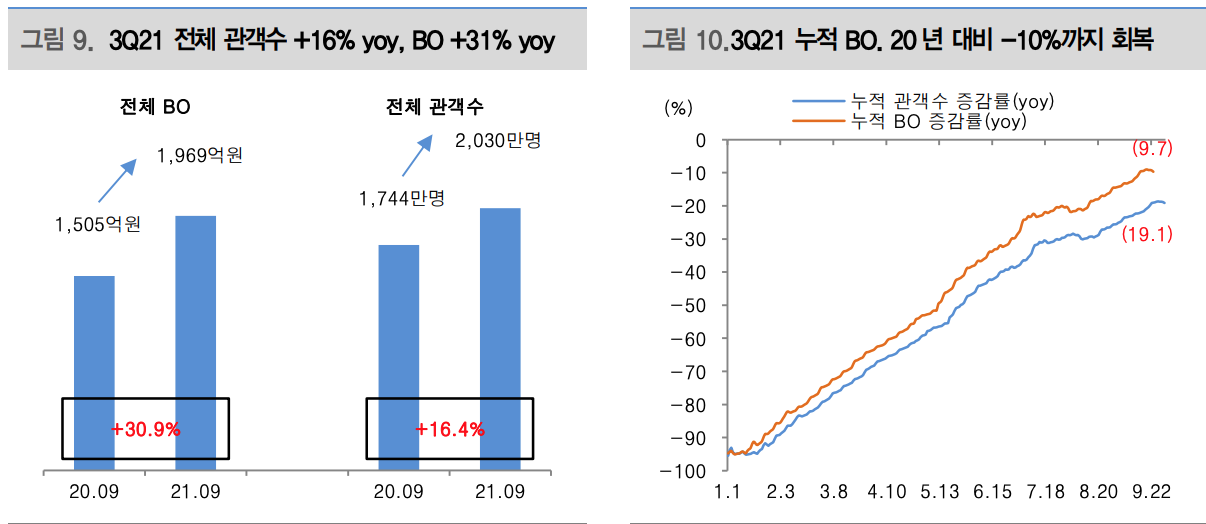 3Q 전국 관객수 2천만명(+16% yoy, +71% qoq), BO 2천억원(+31% yoy, +76% qoq). 누적 관객수 4천만명으로 20년의 81%, 19년의 24% 수준. BO 3.8천억원으로 20년의 90%, 19년의 27% 수준 21E 관객수 6.1천만명으로 20년 수준 3% 상회, 19년의 27% 수준 전망.
