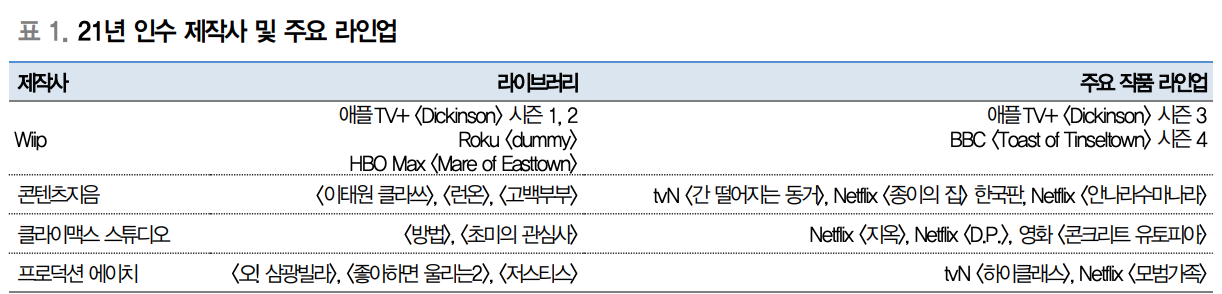 - 이후 넷플릭스 오리지널과 JTBC향 드라마가 급격히 증가한 이유는, 21 년 중반 클라이맥스, 프로덕션H 등 경쟁력 있는 제작사들을 인수하면서 현재 13개의 제작사를 보유한 메가 스튜디오로 탈바꿈 했기 때문