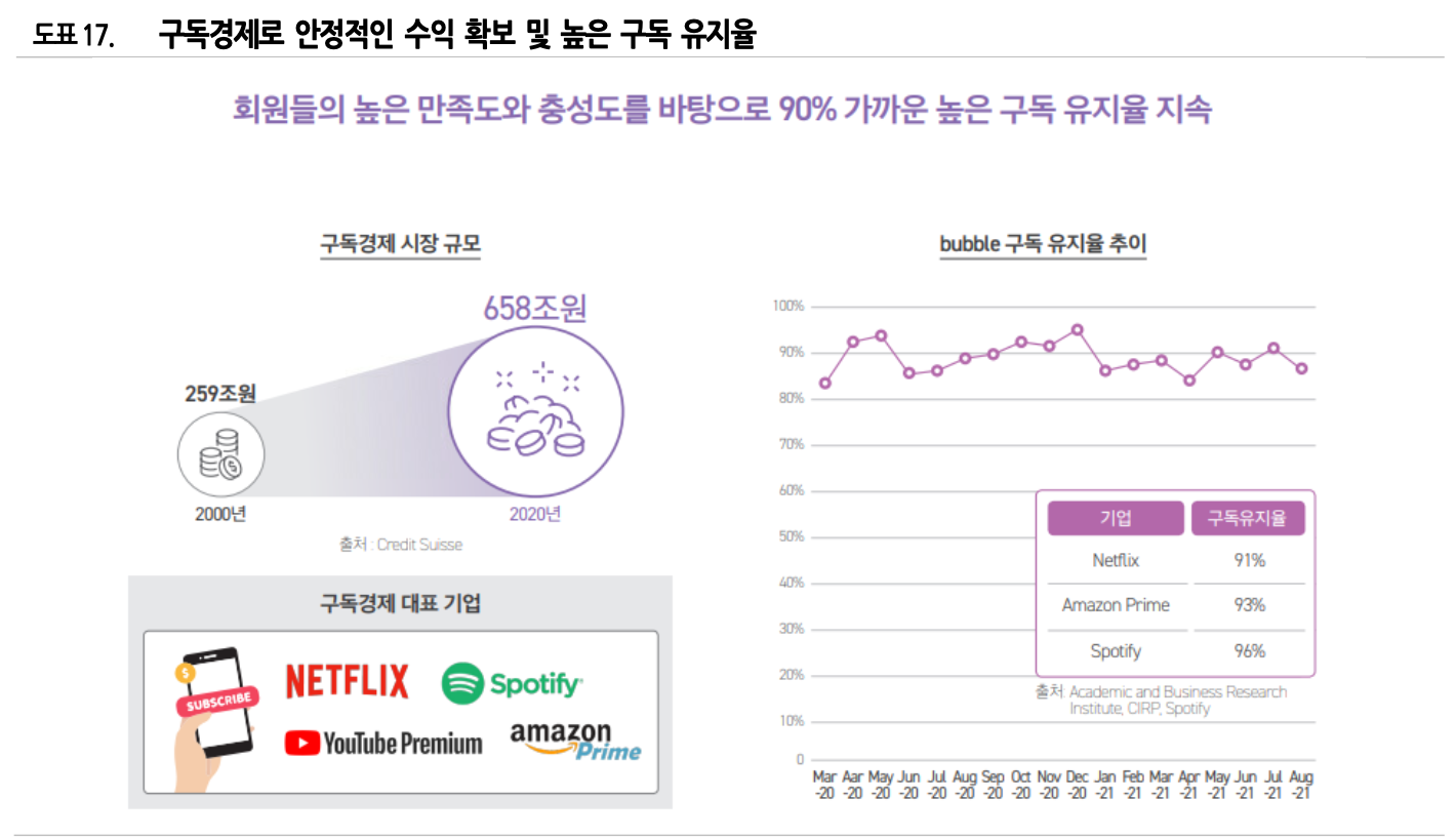 버블은 차별화된 콘텐츠와 유료 구독모델에 기반해 안정적으로 수익을 확보하고 있음. 아티스 트가 구독자의 닉네임을 불러주는 차별화된 서비스로 몰입감을 높이고, 버블에서만 볼 수 있 는 아티스트의 사진이나 영상, 음성 등 다양한 독점 콘텐츠를 제공해 구독 유지율을 90% 수 준으로 높게 유지하고 있음. 구독자 이탈 방지와 팬덤 락인 효과가 동시에 발생하고 있음.