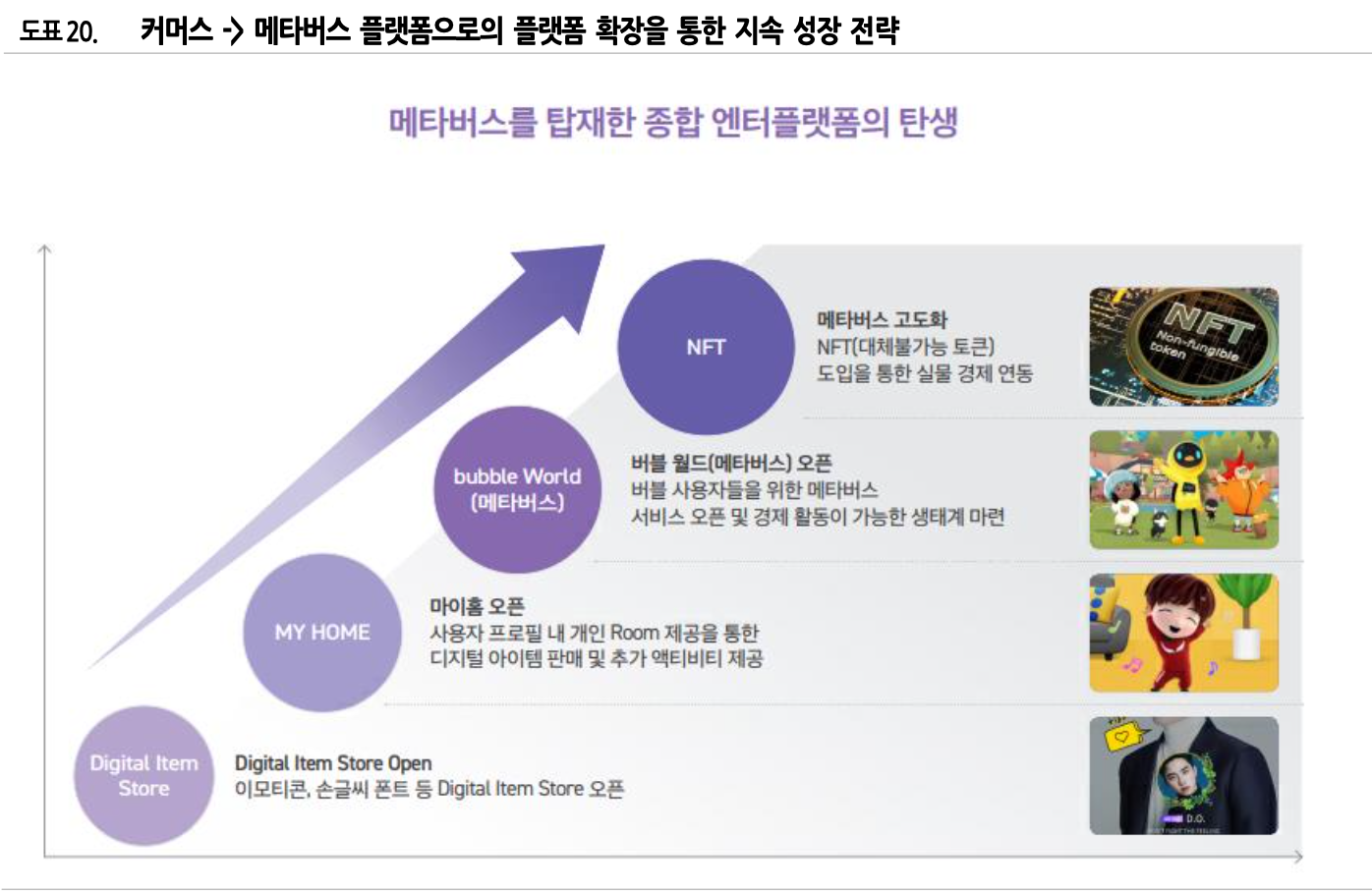 버블은 아이템 스토어를 시작으로 팬커머스 비즈니스로 확장하고 메타버스 서비스를 추가해 종합 엔터플랫폼으로의 도약을 목표. 메타버스 서비스인 ‘마이홈’은 사용자 프로필 내 개인 공 간으로 향후 온라인 콘서트와 팬미팅 참여도 가능하고, NFT 를 활용한 실물경제 연동이 가능 한 공간으로 만들어나갈 예정. 내년 3월 ‘마이홈’ 베타서비스 오픈 예정이며, 관련 매출은 50 억원 정도로 비중이 크진 않을 것으로 전망하나 파급효과는 기대해 볼 필요가 있음.