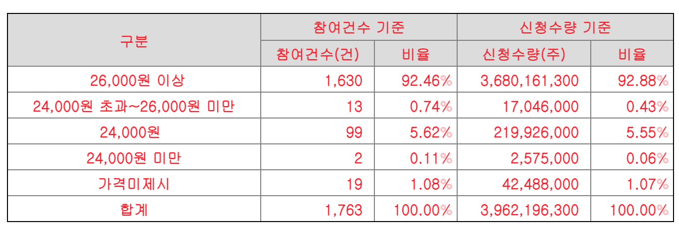 디어유 수요예측 결과 총 1,763곳의 기관투자자가 참여하여 역대 3번째 수요예측 경쟁률인 2001.11:1을 기록하며 상당히 높은 경쟁률을 기록했다. 디어유 희망공모가액 밴드 최상단인 24,000을 초과한 26,000원 이상의 가격을 쓴 기관 비율이 92.46%에에 달해 수요예측 결과로 디어유 주가 흐름을 전망했을때 디어유 공모청약 참가를 통해 수익을 얻을 가능성이 높아 보인다.