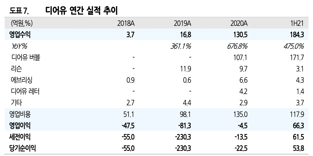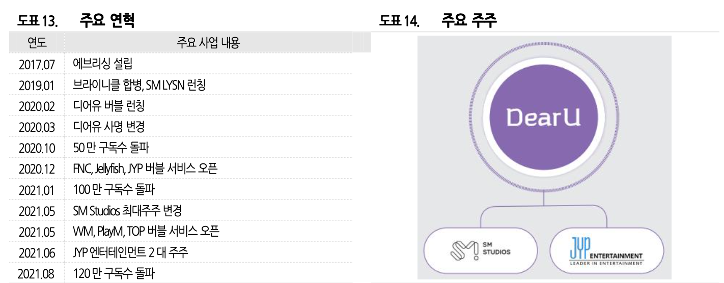 디어유는 에스엠엔터테인먼트의 손자회사로 2017 년 모바일 가라오케 서비스인 에브리싱으로 설립된 이후 2020년 2월 아티스트와의 일대일 프라이빗 채팅 플랫폼인 버블을 런칭.