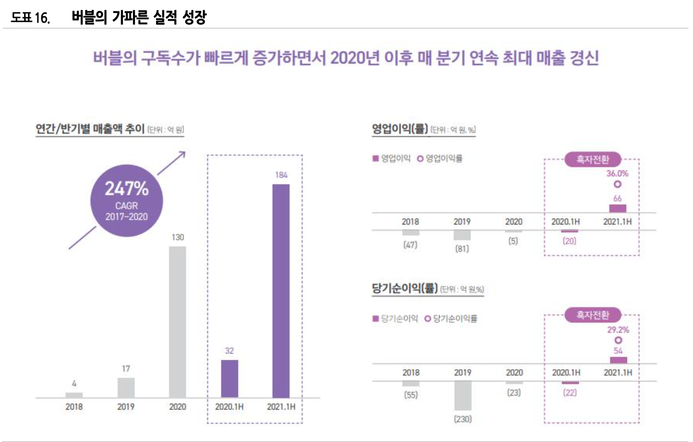 SM 을 시작으로 현재 FNC, Jellyfish, JYP 등 23 개 기획사, 229 명의 아티스트가 버블에 참여하고 있으며 출시 1 년만에 구독자 100 만명을 돌파해 현재는 120 만명을 상회하는 구독자를 확보 하고 있음.
