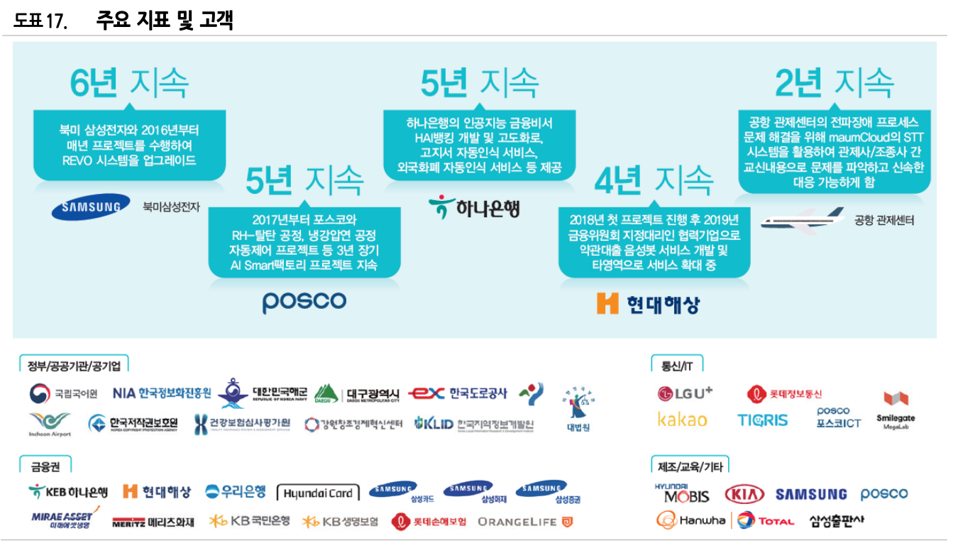 2. 은행권, 방송가 레퍼런스를 바탕으로 삼성전자, 포스코 등 여러 산업으로 확장. 현재 200 여개 기업들로부터 콜을 받은 상황. 올해까지 205 대의 소프트웨어 공급 계약을 확보했으며 2023 년까지 1,300 여개의 계약이 목표.