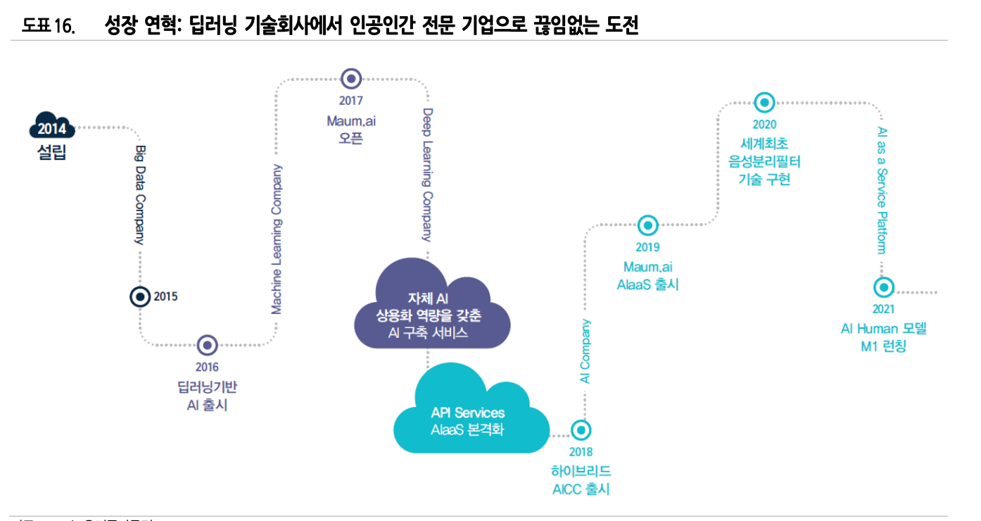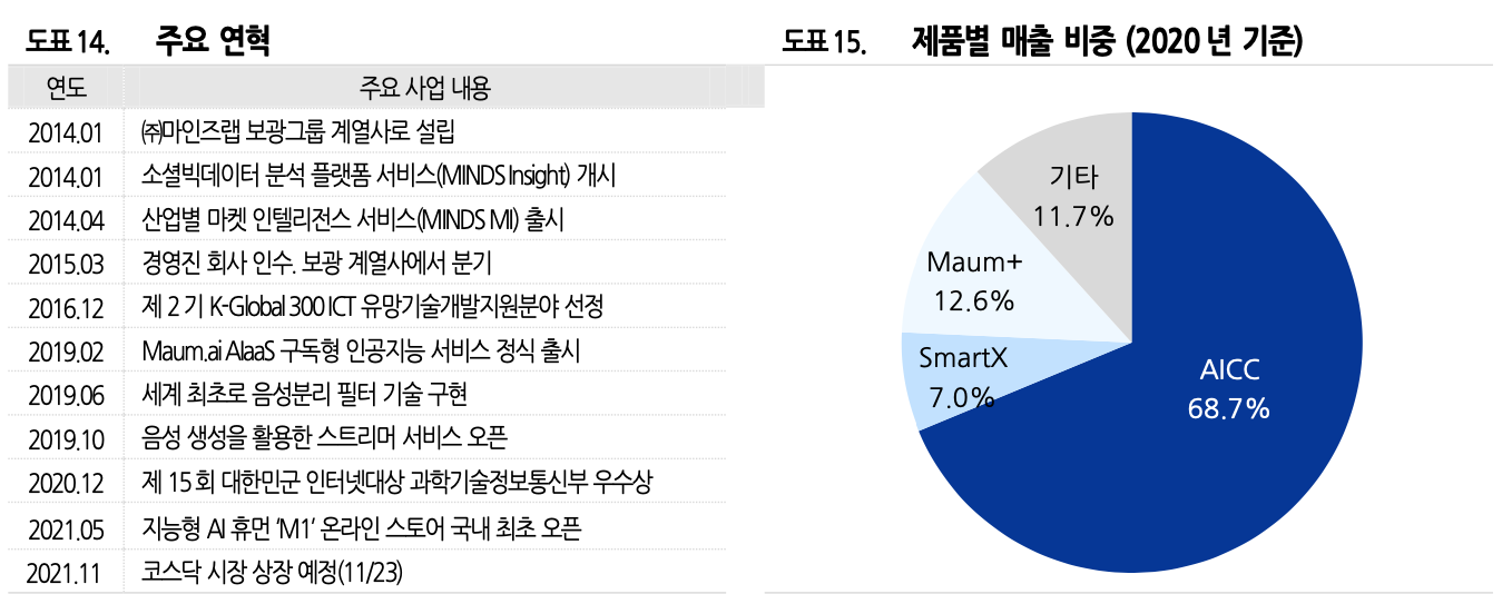 2014 년 (주)마인즈랩 설립. 음성인식, 얼굴인식 등의 AI 기술을 바탕으로 인공지능 컨텍센터 (AICC. Artificial Intelligence Contact Center), 스마트팩토리, 스마트시티용 서비스(SmartX), AI API 서비스(maumCloud), 회의록 및 AI 데이터 구축 서비스(maum+)를 영위 중. 인간이 AI 를 받아들이는데 가장 중요한 립싱크 부문에서 글로벌 최고 수준의 기술력을 갖추고 있음. 마인즈랩은 2021년 11월 23일 코스닥 시장에 기술 특례 상장 예정.