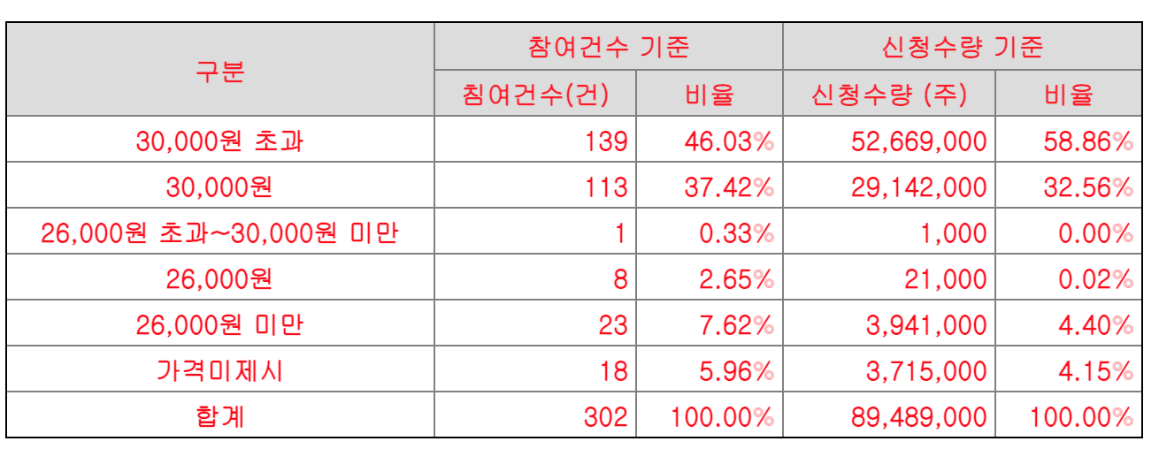 마인즈랩의 수요예측 결과 총 302곳의 기관투자자가 참여하여 상당히 낮은 수요예측 경쟁률인 197.55대 1을 기록했다. 그럼에도 불구하고 공모가 최상단인 30,000원 이상을 제시한 비율이 과반수를 훨씬 뛰어넘은 84%를 기록해 고평가 논란을 피하기 어려울것으로 판단된다.