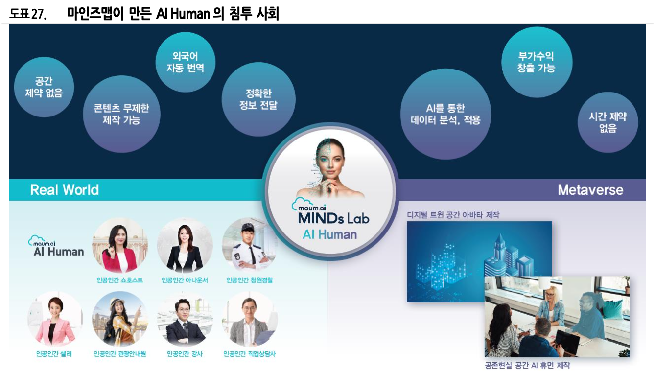 마인즈랩의 인공인간은 AI 응용 시장 중에서도 초기에 있어 향후 성장성을 예측하기 쉽지 않다. 다만 코로나19로 인해 비대면 서비스에 대한 소비자 수용도가 높아졌고 메타버스 등 가상세계와 가상인간에 대한 관심과 활용도가 높아지고 있는 대외 환경은 긍정적이다. 메타버스 여행 플랫폼, VR 부동산 투어, 가상 전시회 등 메타버스 관련 기업들과의 제휴가 늘고 있다.