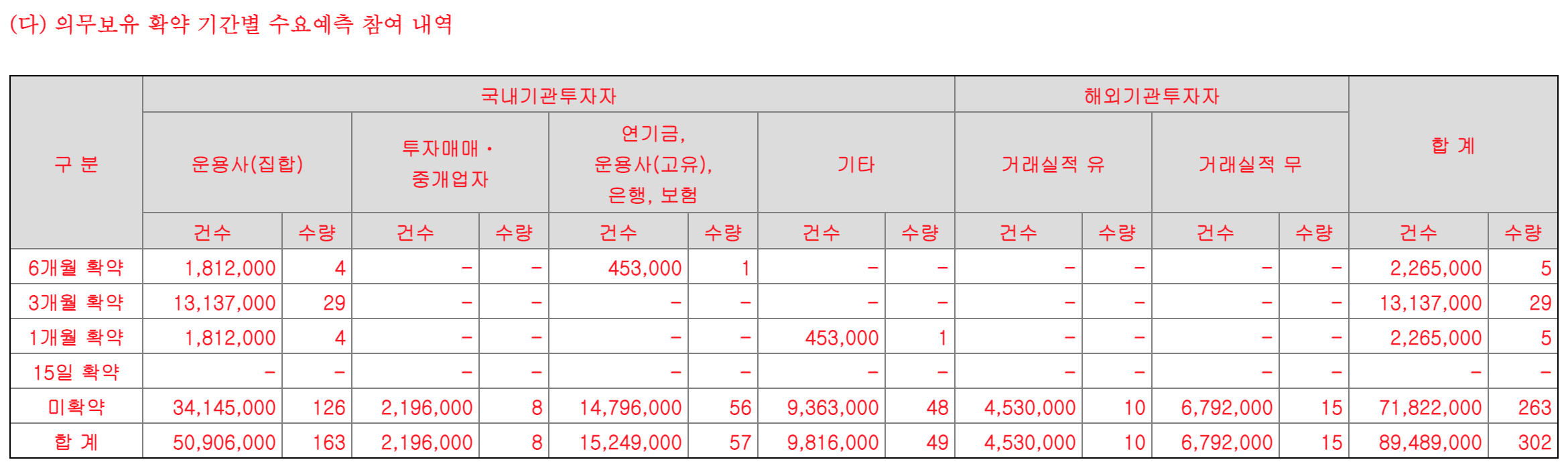 마인즈랩의 상장 후 최단 15일에서 최장 6개월간 주식을 팔지 않겠단 의무보유확약을 신청한 기관은 전체의 15.6%(163곳)이라 기관 경쟁률 대비 저조해 수요예측 결과로 놓고 봤을때 마인즈랩 공모 청약 참여로 수익을 얻기 힘들것으로 예상된다.