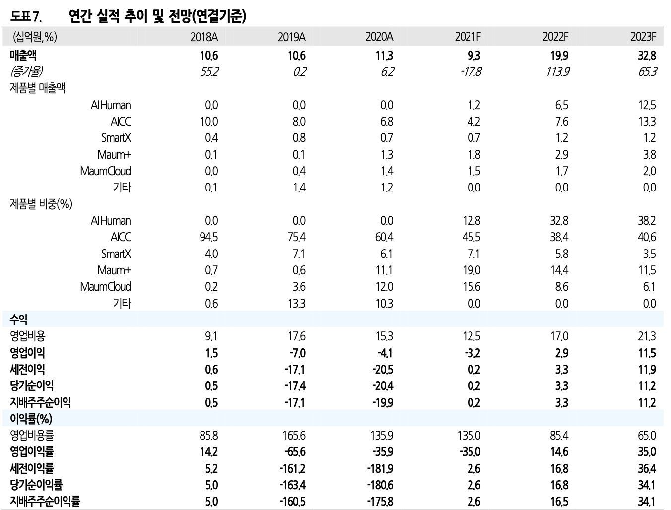 제품별 매출비중(2020 년 연결기준)은 AICC 60.4%, SmartX 6.1%, Maum+ 11.1%, MaumCloud 12.0%, 기타 10.3% 기록.
