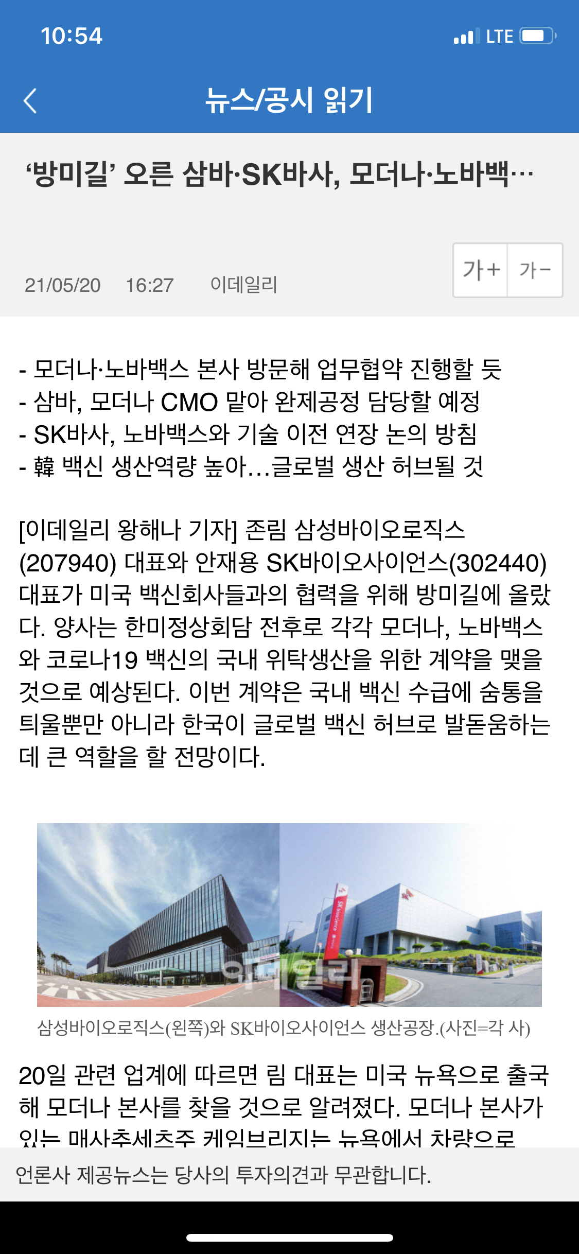 한미 정상회담을 앞두고 5월4일을 시작으로 녹십자 삼성바이오로직스 sk바이오사이언스 등 한국의 CMO회사들의 주가는 모더나 백신의 위탁생산 기대감으로 상승했었다.