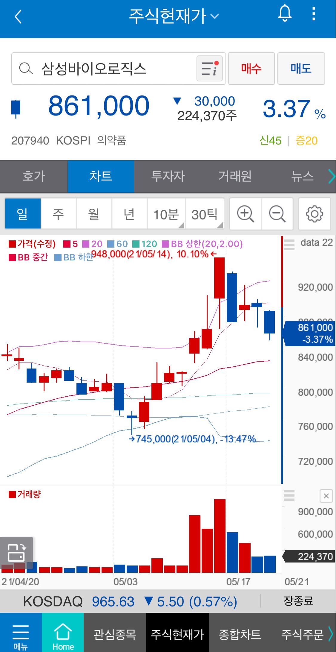 주식판에 있는 이야기인 소문에 사서 뉴스에 팔아라는 격언처럼 정상회담이 시작되고 삼성바이오로직스의 모더나 위탁생산계약을 체결했다는 호재성 뉴스가 나왔지만 주가가 조정을 받으며 볼린저밴드 상단과 이동평균선 5일선 밑까지 내려오게 되었다.