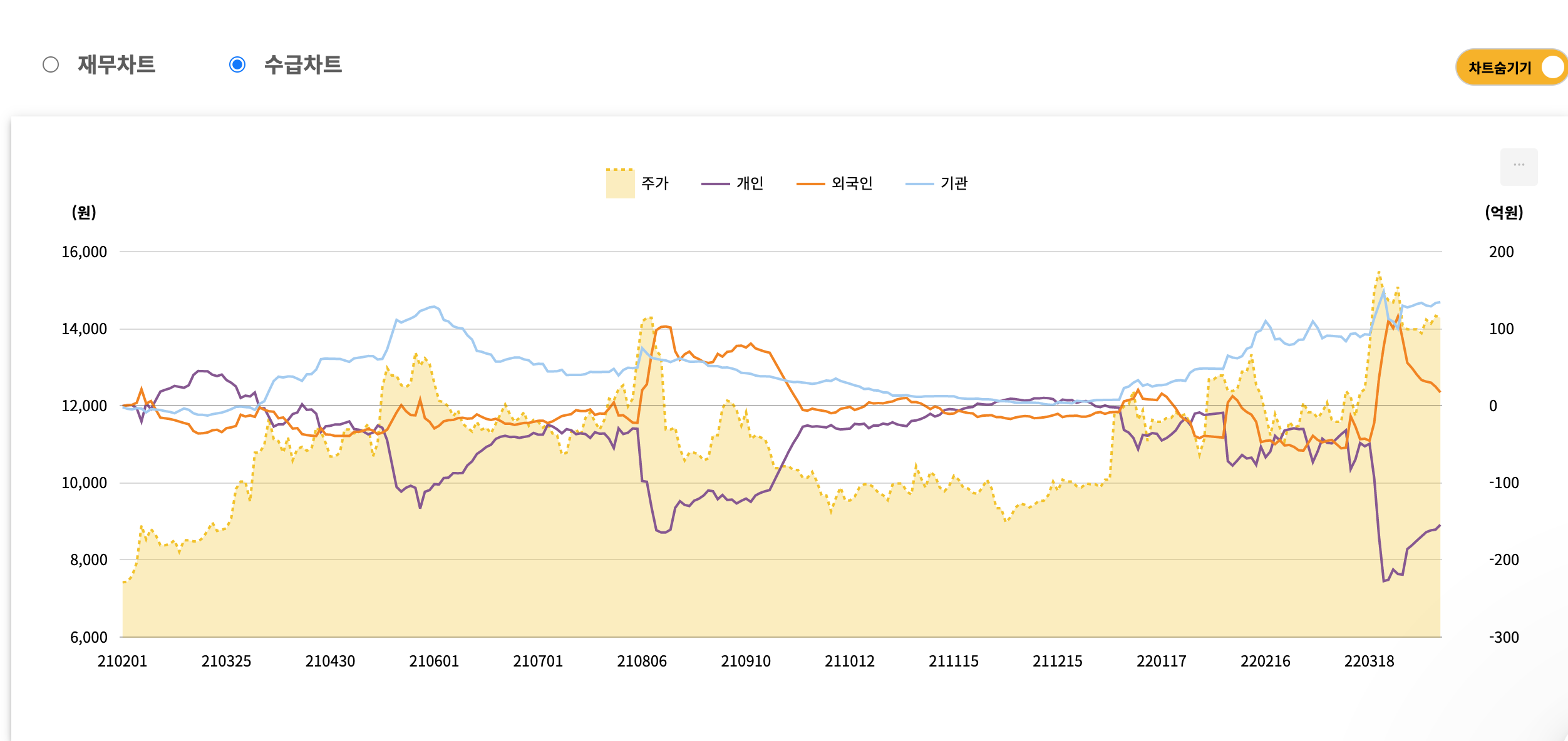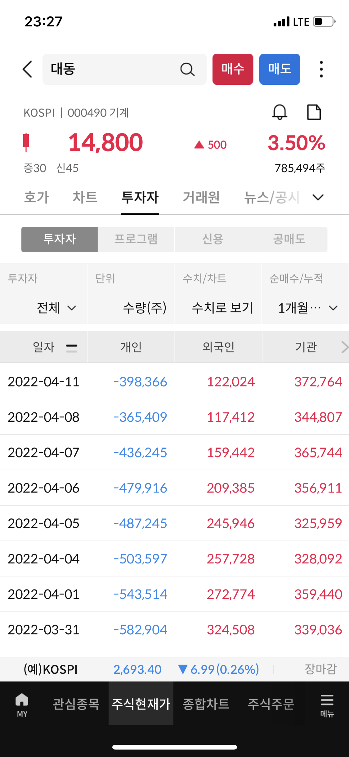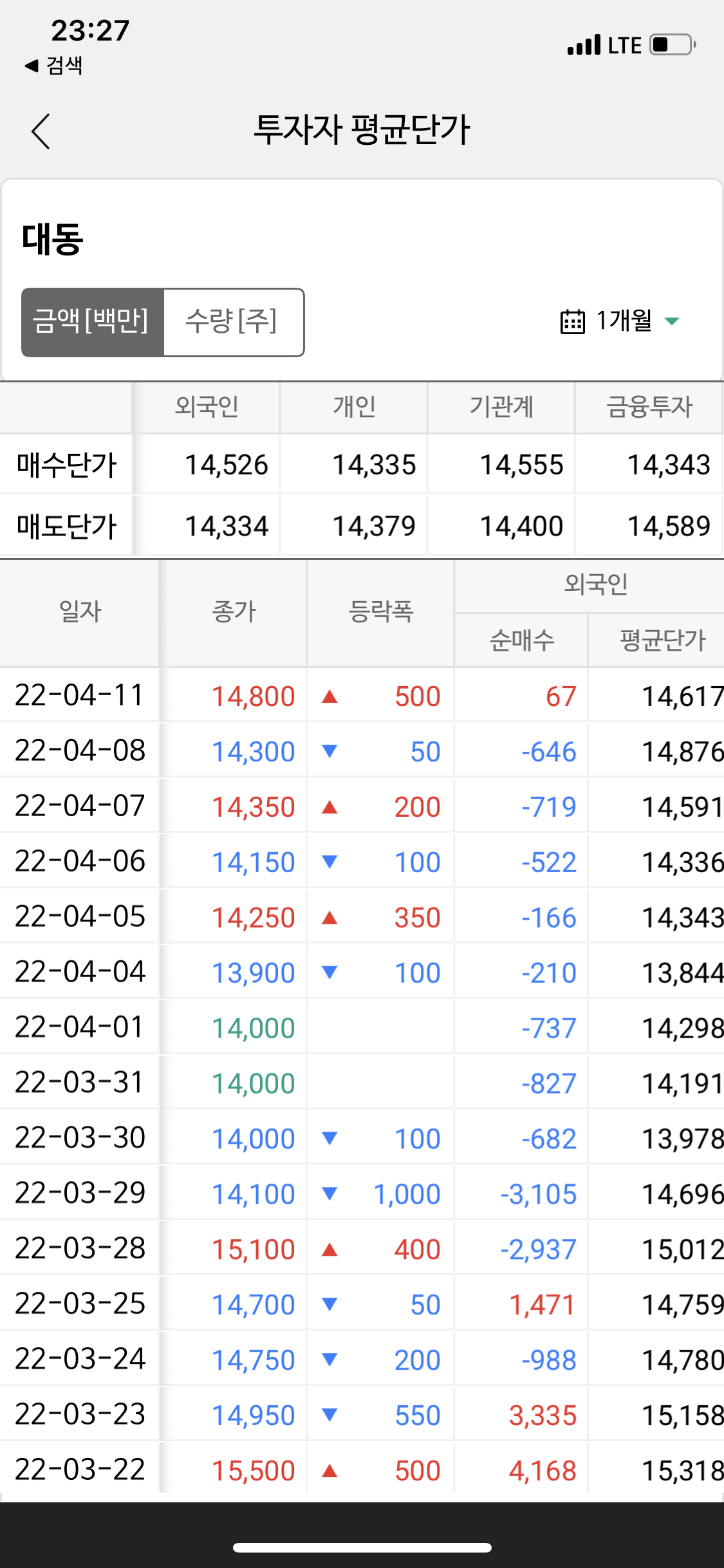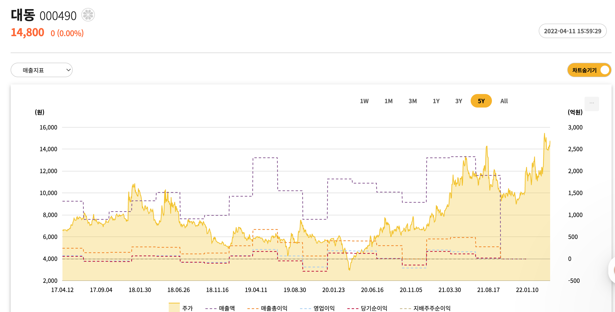 2022년 04월 11일자 개인/외국인/기관 매매동향을 보면 대동 주식을 미국 금리인상 우려로 인해 전체적인 코스피 시장의 하락에도 불구하고 꾸준하게 외국인과 기관의 수급이 들어오고 있어 대동의 실적 증가와 외형적 성장에 대한 기대감을 갖고 있는것으로 보인다.