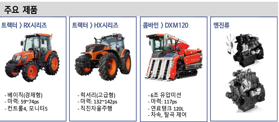 농기계용 엔진 및 제품을 생산, 국내외에 판매하는 농기계전문기업이다. 1947년 설립, 1975년 유가증권시장에 상장했다. 한국농촌경제연구원에 따르면 국내 시장 점유율 1위로 추정된다. 주요 제품은 트랙터, 콤바인, 엔진 등이다. 2021년 전체 매출액 대비 비중은 트랙터외 89%, 실린더헤드외 10%, 기타 1%다.