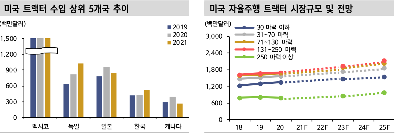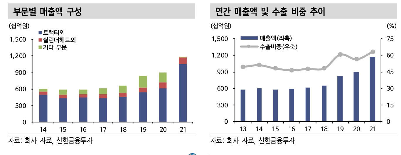 해외사업 성장이 지속, 판매를 강화한다. 2021년 북미, 유럽지역 매출은 각각 46.1%, 56.1% YoY 증가했다. 기획조정실 산하 글로벌사업 담당 본부를 신설하는 등 조직을 개편했다. 주력시장인 북미지역은 ‘하비 파머’ 수요를 기반으로 한 중소형 트랙터 중심 시장 확대가 기대된다. 유럽시장은 환경 규제 강화에 대응해 기 술개발을 마쳤다. 향후 20마력 이하 마이크로트랙터까지 라인업 확장이 기대된다.
