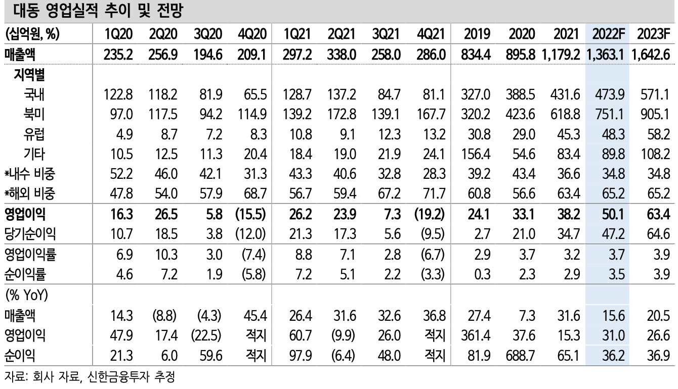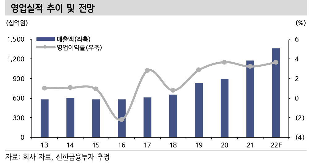 2021년 매출액 11,792억원(+31.6% YoY), 영업이익 382억원(+15.3% YoY)을 기 록했다. 사상 첫 매출액 1조원대에 진입했다. 북미향 수출 확대가 주요했다. 북미 지역 매출액은 6,188억원(+46.1% YoY)으로 국내 4,316억원(+11.1% YoY)을 상 회했다. 전체 매출액 대비 해외 매출 비중은 2020년 57%에서 2021년 63%로 확대됐다.