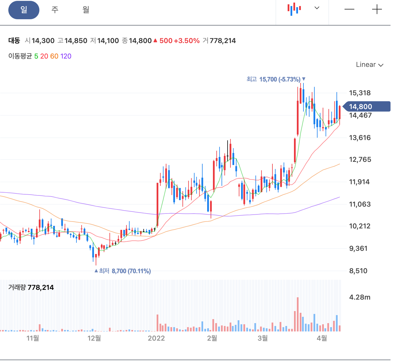 대동 주가는 볼린저밴드 산단에 위치하며 14,800원(2022/04/11)을 기록하고 있는데 이는 대동의 52주 신고가인 15,700원대비 5.73% 조정 받은 가격이다.