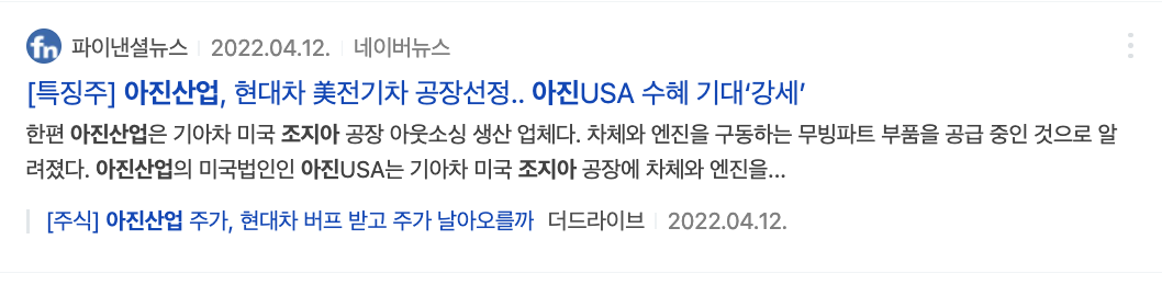 아진산업은 기아 미국 조지아 공장 아웃소싱 업체로 차체와 엔진 구동 부품을 공급하고 있어 조지아 공장 증설시 수혜가 예상됨