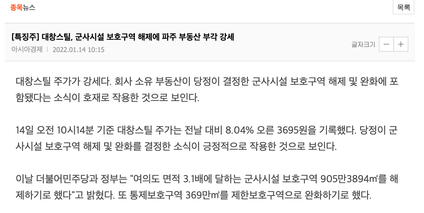 대창스틸은 DMZ 인근 파주 공장 및 400억 규모 토지 보유를 하고 있어 바이든 DMZ 방문시 주가 상승이 예상된다.