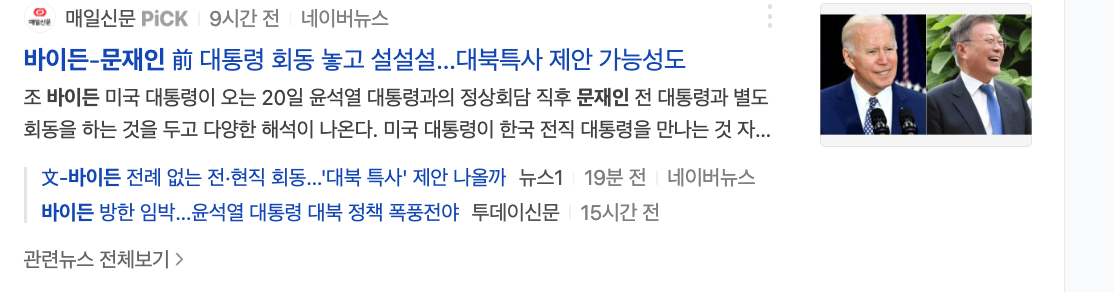 또한, 바이든 대통령과 문재인 전 대통령 회동시 대북특사 제안 설도 나오고 있어 과연 대북정책 보따리를 어떤 것을 풀 것인지에 대한 관심이 집중되고 있다.