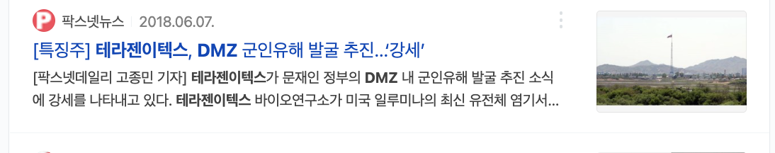 DMZ 내 전사자 유해 발굴이 실현되면 DNA 염기 서열 분야가 부각될 전망인데 테라젠이텍스는 미국의 유전체 분석장비 최대 전문업체인 일루미나의 최신 기술을 국내 독점하는 등 관련기술을 보유하고 있음.
