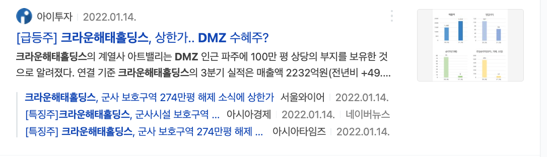크라운해태홀딩스의 계열사 아트밸리는 DMZ 인근 파주에 100만 평 상당의 부지를 보유한 것으로 알려져 있어 바이든 DMZ 방문시 수혜를 입을것으로 예상된다.