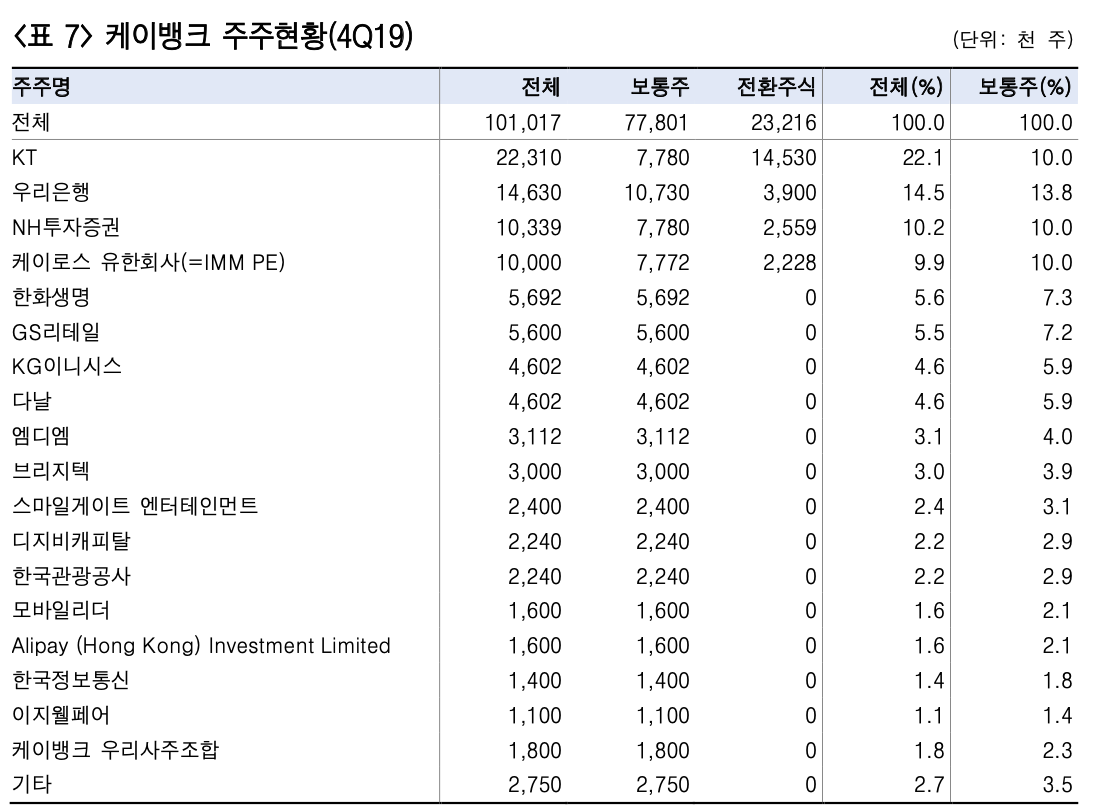 결론적으로 케이뱅크는 기입증된 여수신 경쟁력에서 파생된 높은 성장성과 차별 화된 수익성만으로도 기업가치 6조원, PBR 3.5배라는 높은 밸류에이션을 정당화 할 수 있다. 다만 향후 플랫폼 수익 창출력에 대한 입증이 필요하며, 이를 충족해야만 추가적인 기업가치 상승여력이 보장될 것이다.