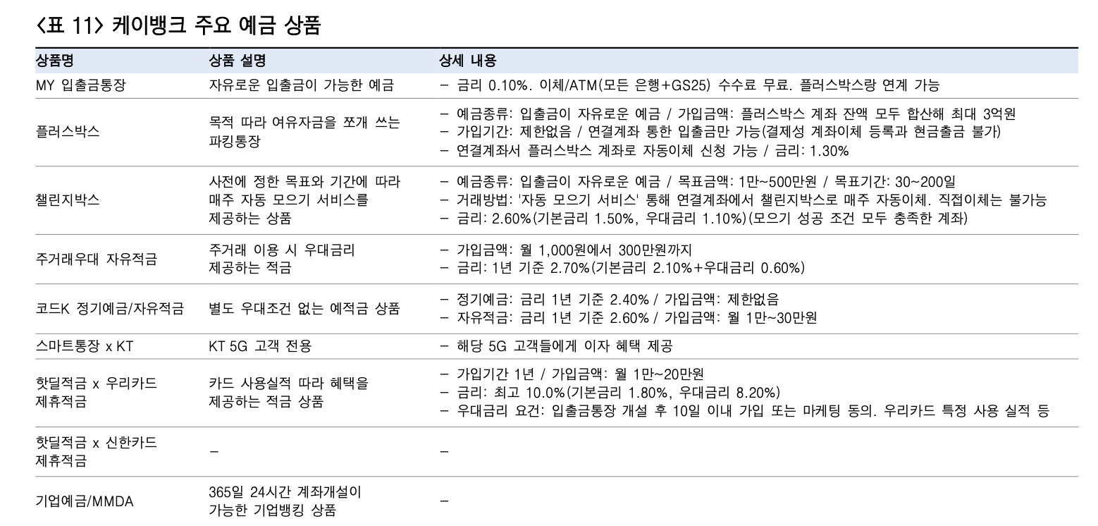 수신 상품 개발 및 공급도 이어지고 있다. 플러스박스나 챌린지박스를 통해 재미를 추구하면서도 고객들에게 실질적인 금리 혜택을 제공하는 수시입출식 예금을 제공하고 있다. 또한 우리카드나 신한카드와 연계한 제휴적금을 통해 상품 특성도 다변화되고 있다. 상품 경쟁력 제고와 적극적인 수신 영업 전략은 케이뱅크의 높은 성장성으로 연결되고 있다.
