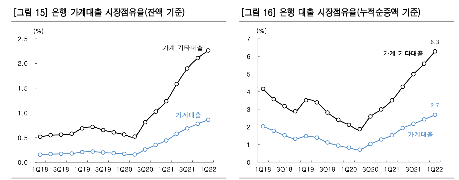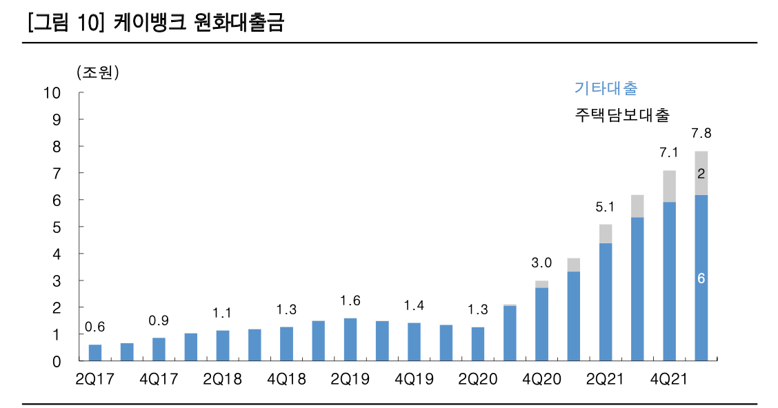 은행 대출시장에서의 침투율이 높아진다. 대출 상품 라인업이 확충된 덕분이다. 2017년 영업 개시 이후에는 한동안 신용대출에 집중했지만, 2020~2021년에는 아파트담보대출과 전세대출이 출시됐고, 올해 5월에는 개인사업자대출도 신설됐 다. 신용대출 내에서는 작년 하반기부터 고신용자뿐만 아니라 중/저신용자 대상 적극적으로 대출을 공급하고 있다. 이에 2020년 2분기 1.3조원이었던 원화대출 금은 올해 1분기 7.8조원까지 확대됐다. 특히 시장 파이가 훨씬 큰 주택담보대출 영업에 집중한 결과 동 대출 비중이 1분기에 21%까지 상승한 것도 고무적이다. 결론적으로 대출 라인업 확대와 적극적인 여신 영업 전략을 통해 대출 시장점유율이 개선되고 있다.