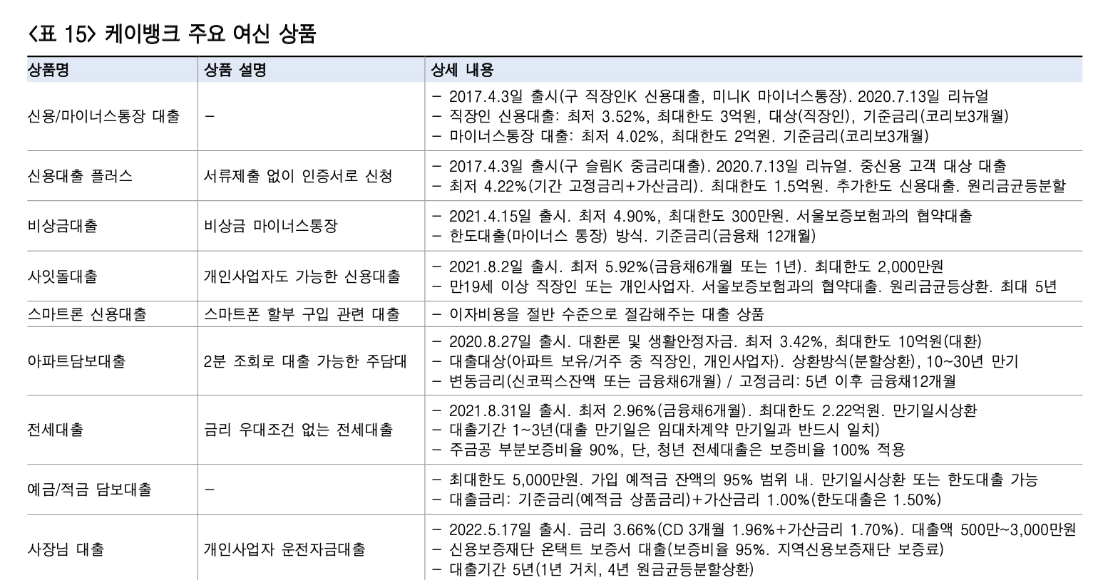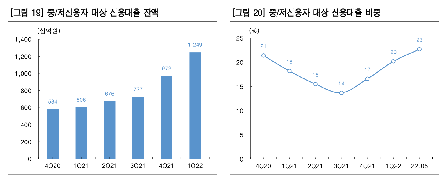 2021년 3분기 말 0.7조원이던 중/저신용자 대상 신용대출은 올해 1분기 말 1.2 조원까지 확대되며 가계신용대출 내 비중이 20.2%까지 확대됐다. 5월 말 기준으 로는 비중이 22.7%까지 상승해 올해 말 목표치 25%는 수월하게 달성할 전망이 다. 통신과 쇼핑 데이터를 활용한 맞춤형 CSS 개발로 금융이력부족자(thin filer) 에 대한 대출 승인율이 32% 개선되는 등 대출 심사 프로세스가 개선됐고, 적극 적으로 관련 대출 영업을 한 덕분이다.