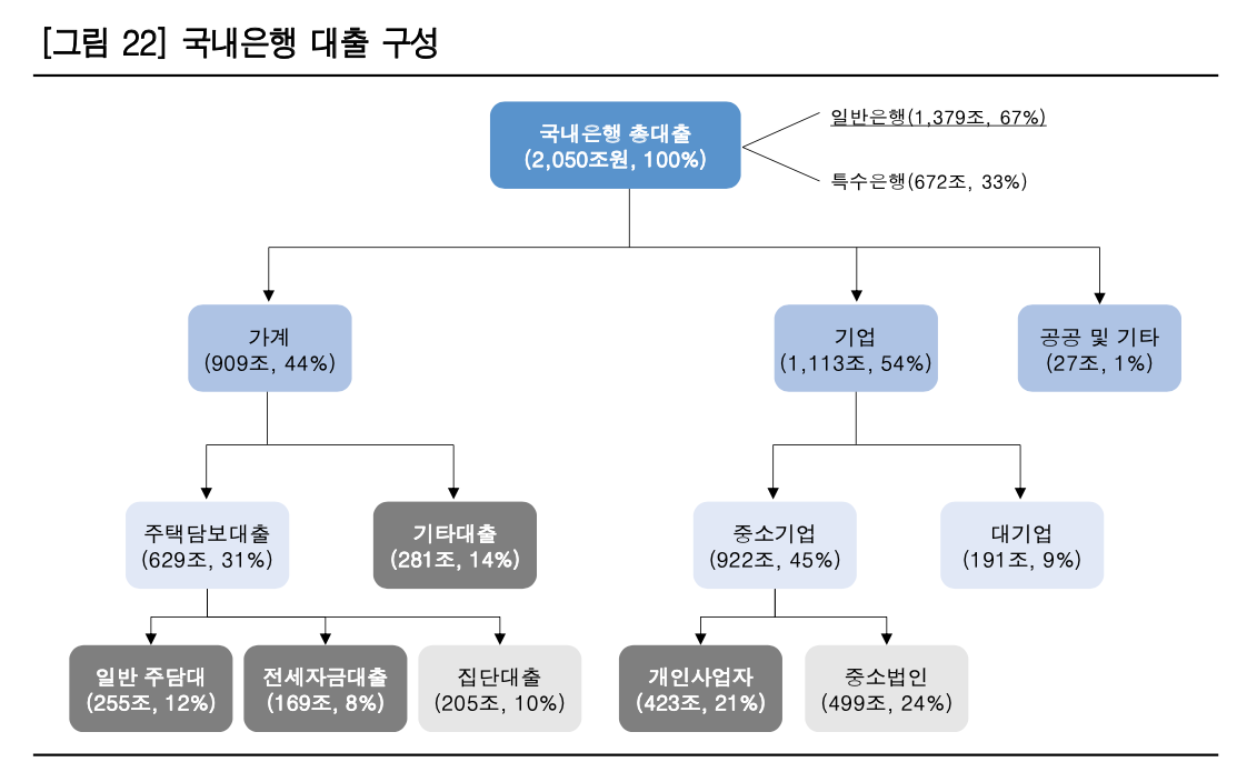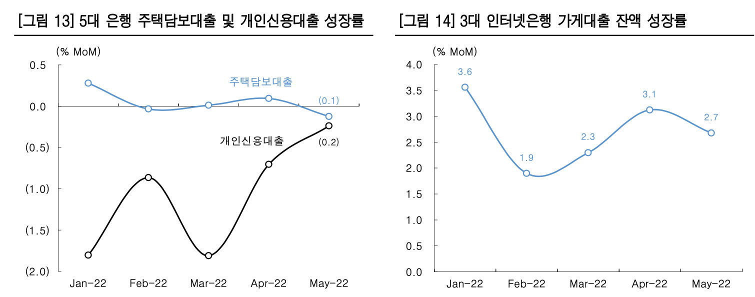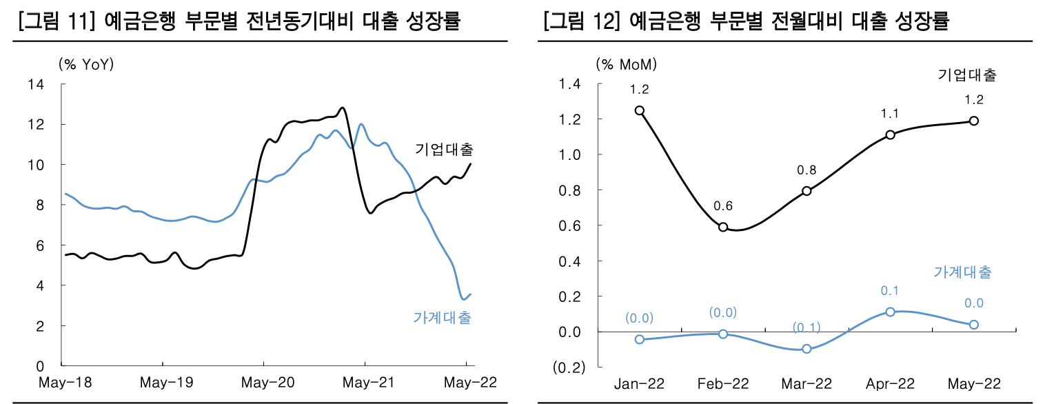 올해에 국한해서 보면 가계대출 내 케이뱅크를 포함한 인터넷은행들의 약진이 두드러진다. 올해 5월 예금은행 가계대출은 기업대출 대비 상대적으로 빨랐던 대출 금리 상승과 강화된 대출 규제 등으로 전년동기대비 성장률이 3.5%로 크게 떨어졌다. 반면 예금은행 기업대출은 전년동기대비 10% 증가했다. 전월대비 대출 성장률로 보면 예금은행 기업대출은 매월 1% 내외로 늘지만, 가계대출은 연중 내 내 잔액이 횡보세다. 결국 은행업 전체 기준 대출 시장 분위기는 기업대출 호황, 가계대출 부진으로 요약할 수 있다.
