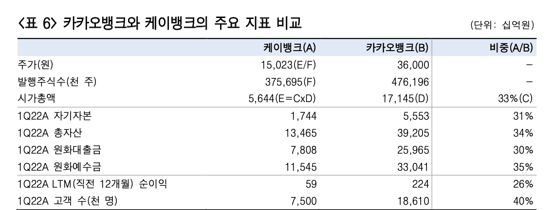 한편 카카오뱅크와 케이뱅크의 주요 영업지표를 비교해보면, 대체적으로 케이뱅크의 주요 지표는 카카오뱅크 대비 26~40%의 비중을 차지한다. 이를 가감조정 없이 멀티플과 유사한 개념으로서 케이뱅크의 기업가치 산출에 단순 대입할 경우 케이뱅크의 기업가치 평균은 5.6조원으로 도출할 수 있다<표 6>.