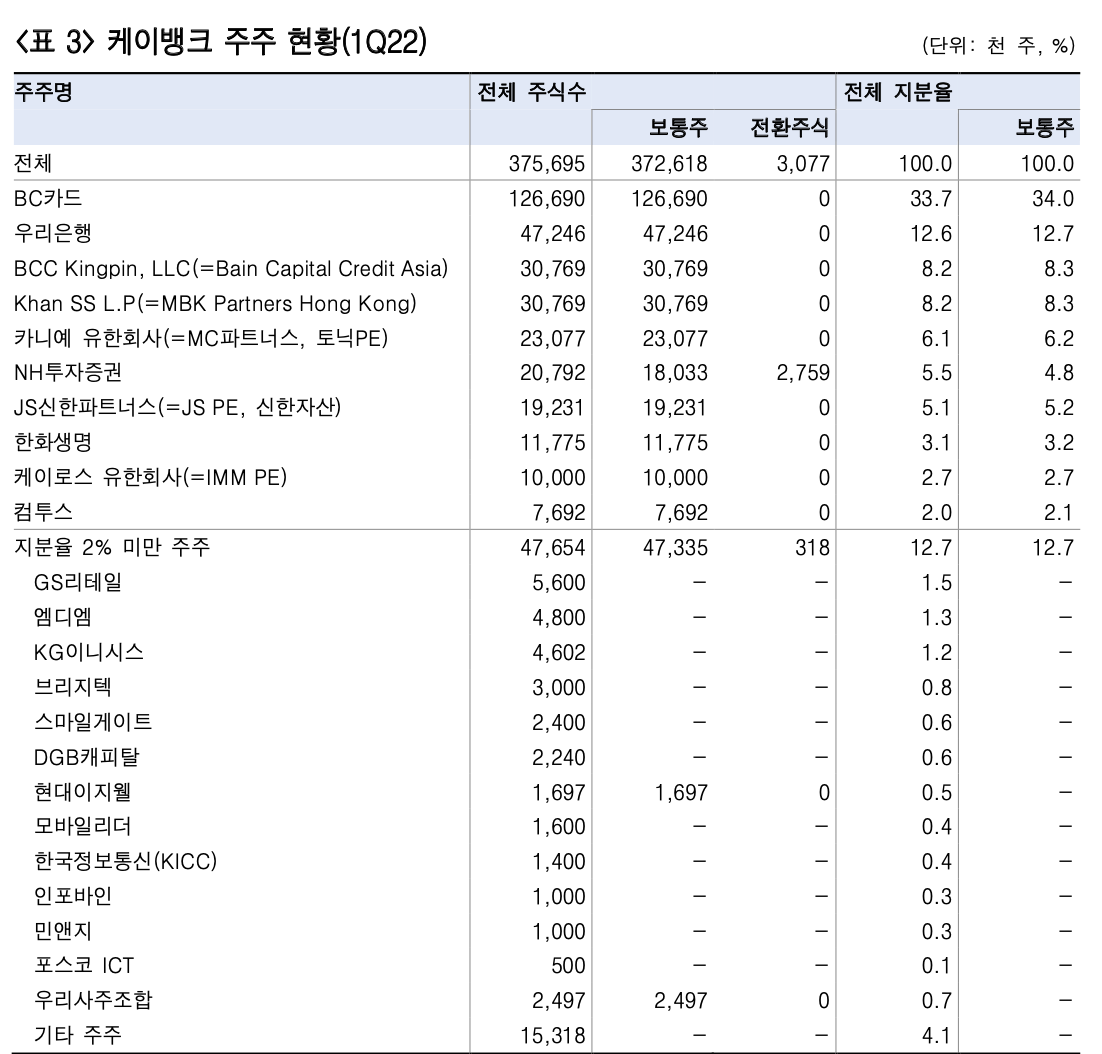 하지만 이때 KT가 지분 70%를 보유한 BC카드가 케이뱅크의 구원투수로 등판한다. 2020년 3분기 BC카드가 KT가 보유한 케이뱅크 지분 전량을 인수하고 3,966억원의 주주배정 유상증자에도 참여한 것이다. 이에 지분율 기준으로 BC카드가 지분율 34%로 최대주주로 등극했으며, 우리은행, NH투자증권 등 대형사 위주의 지분 구조가 더욱 공고해졌다. 지배구조에 안정성이 더해진 것이다.