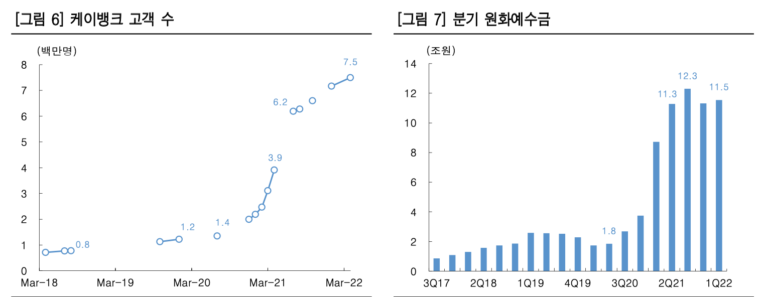 업비트를 통한 케이뱅크 고객 유입 효과는 인상적이다. 2020년 6월 말 135만명 이었던 케이뱅크 고객 수는 1년만인 2021년 6월 말에 619만명까지 증가했다. 엄청난 마케팅 효과다. 해당 고객 유입은 케이뱅크의 원화예수금 확대로 연결됐다. 업비트 고객들의 예치금이 케이뱅크 입장에서는 기업자유예금으로 분류되기 때문이다. 결과적으로 지배구조 개편에 따른 영업 정상화와 업비트 고객자금 유입이 동시에 발생하면서 케이뱅크 원화예수금은 2020년 6월 말 1.8조원에서 2021년 6월 말 11.3조원까지 크게 늘어났다.