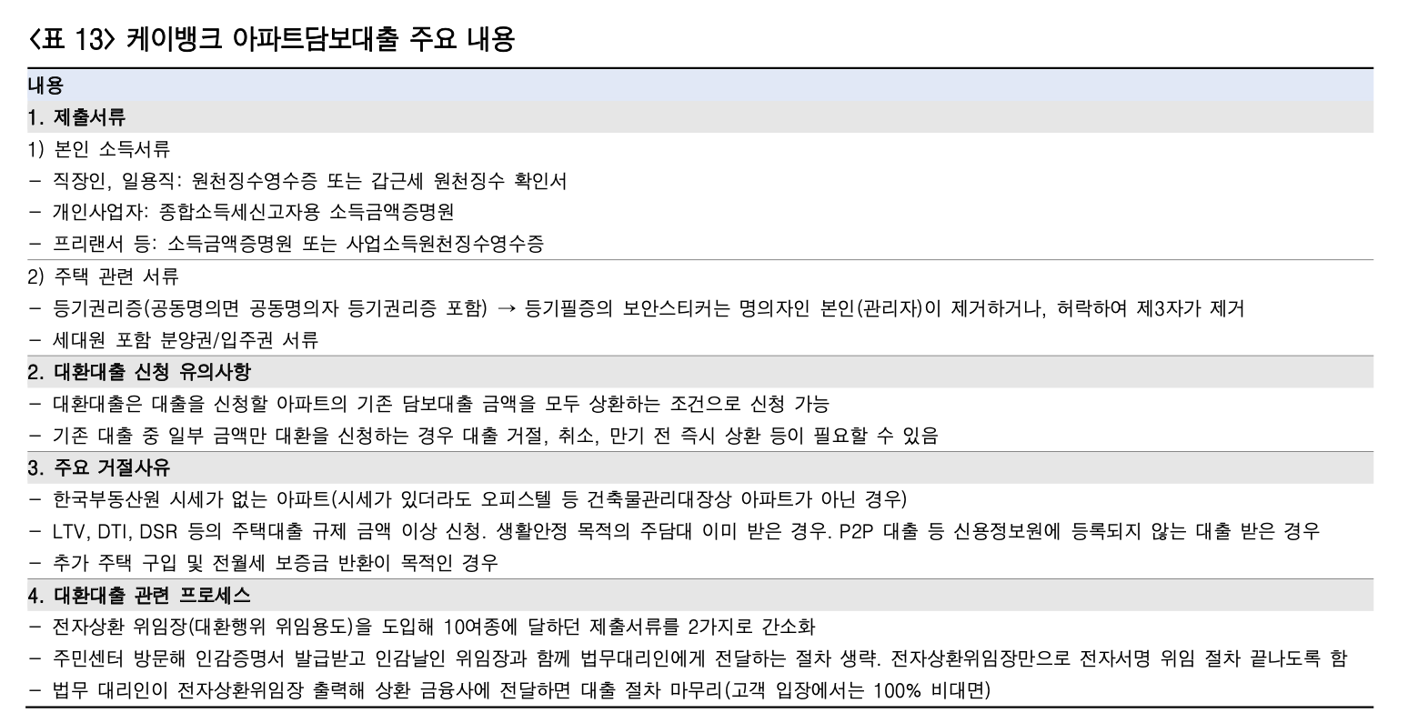 한편 카카오뱅크가 올해 2월 주택구입자금까지 포괄하는 주택담보대출을 출시했다. 주택구입용은 소유권 이전등기가 필요한데 카카오뱅크와 제휴를 맺은 법무사가 잔금일에 고객을 직접 방문해 등기절차를 대행한다. 카카오뱅크 사례를 고려 하면 주택구입용으로도 고객 입장에서 100% 비대면 대출이 구현될 수 있는 셈 이어서 향후 케이뱅크도 주택구입자금용 주담대 시장으로 사업을 확대할 것으로 예상된다.