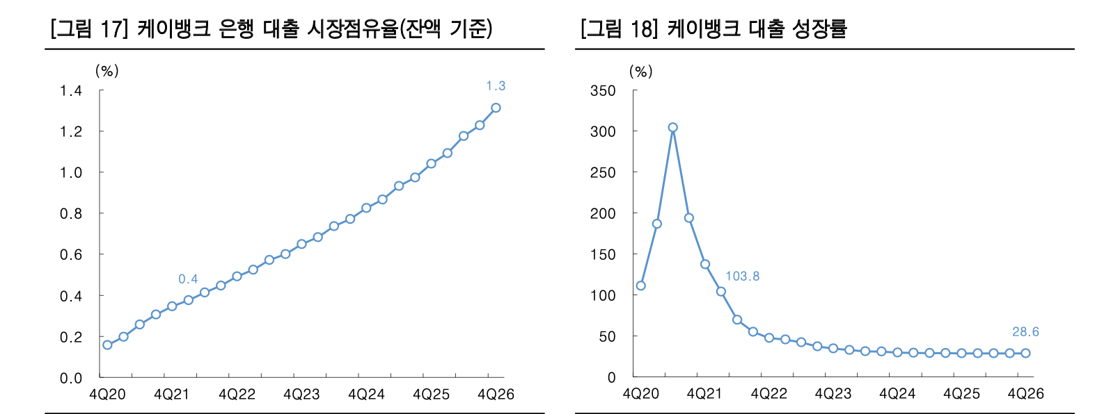 유사한 관점에서 케이뱅크의 기업대출까지 포함한 전체 은행 대출 내 점유율은 1 분기 기준 0.4%에 불과하다. 다만 향후 연 30~40%의 높은 성장률을 이어나가 면서 2026년 4분기 말 전체 대출 시장점유율은 1.3%로 현재 대비 3.5배 개선될 것이다. 원화대출금 잔액은 동기간 3.9배 커져 30조원에 이를 전망이다. 높은 밸류에이션을 정당화할 빠른 성장에 대한 가시성이 높다.