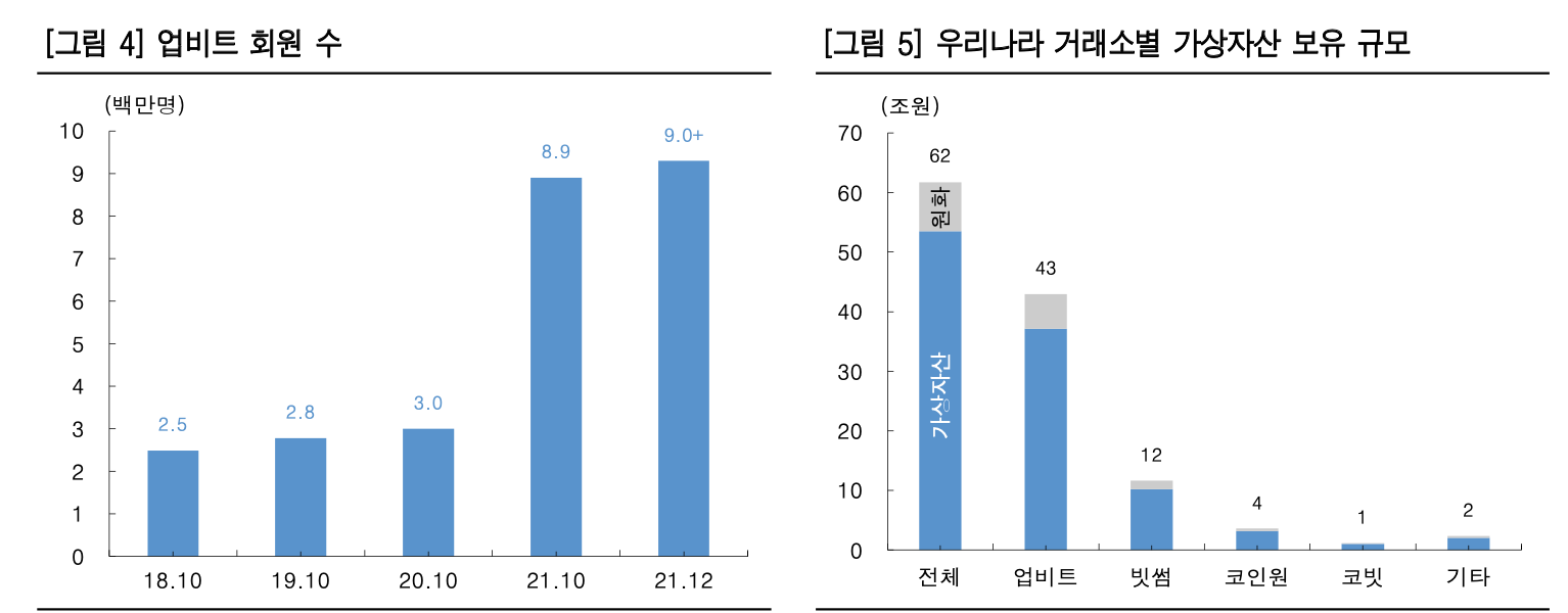 2020년 10월 300만명에 불과하던 업비트 회원 수는 2021년 말 900만명을 돌 파했고, 업비트 일평균 거래대금은 2020년 하반기 0.6조원에서 2021년 2분기 16조원까지 급증했다. 가상자산 투자 열풍이 불면서 국내 가상자산거래소 시장점 유율 80%를 확보한 업비트로 고객 트래픽과 거래가 쏠린 결과다. 업비트에서 투자하려면 케이뱅크에 가입하고, 은행 계좌로 자금을 이체해야 한다. 결국 2020~2021년 업비트의 성장은 케이뱅크 고객 활동성 지표 개선으로 직결됐다.