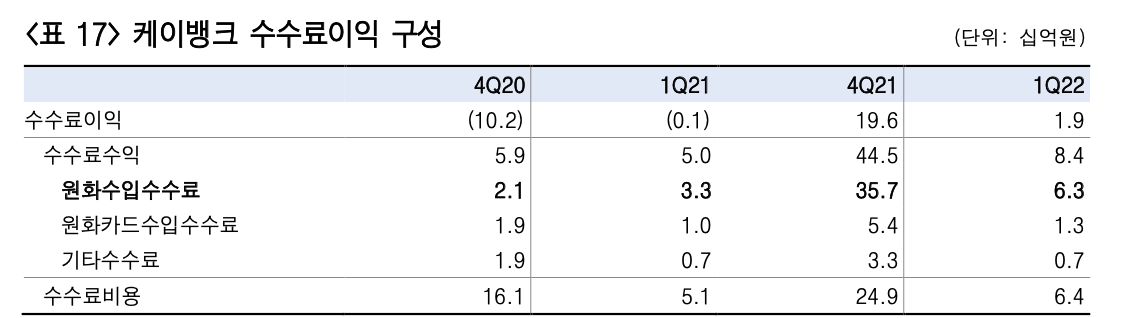 수수료 비즈니스에서의 경쟁 우위는 핀테크 기업으로서 높은 멀티플을 정당화하기 위한 필수적 역량이다. 케이뱅크가 증권계좌 개설, 연계대출, 제휴 신용카드 등 관련 비즈니스를 확대하는 점은 긍정적이다. 다만 아직까지 수익 규모가 작은 점은 개선 과제다. 2021년 카카오뱅크의 IR 기준 fee 수익은 1,686억원, 플랫폼 수익은 932억원이다. 해당 수익들을 합친 것과 유사한 IFRS상 수수료수익은 2,541억원이다. 반면 케이뱅크의 IFRS상 2021년 수수료수익은 445억원이다.