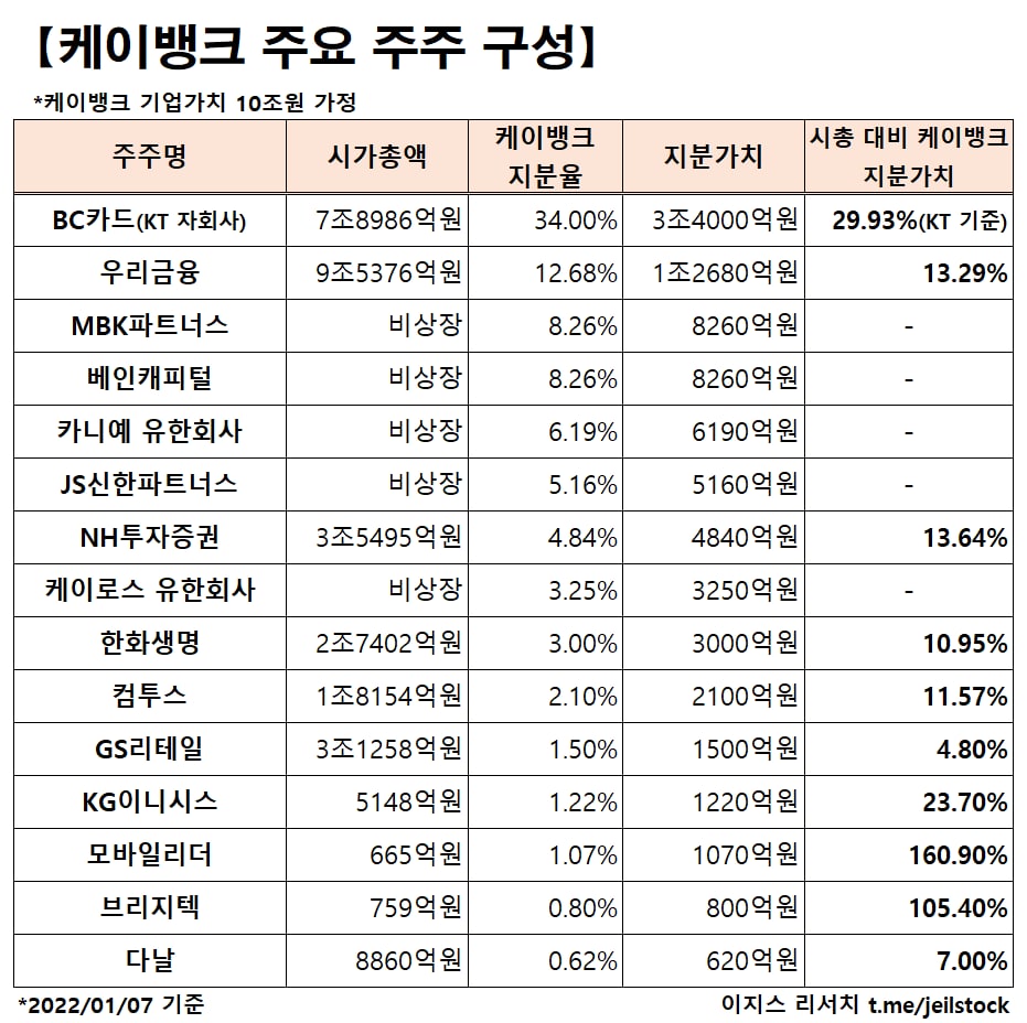 케이뱅크 상장시 시가총액 대비 케이뱅크 지분가치가 높은 종목에 주목할 필요가 있어 보인다.