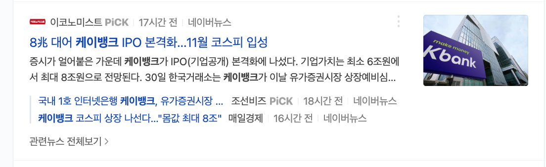 1. 케이뱅크 상장 예비 심사 청구 발표(IPO) https://www.sedaily.com/NewsView/267F76A1AP IB&Deal 뉴스: ‘국내 인터넷은행 1호’인 케이뱅크가 기업공개(IPO) 일정에 닻을 올려 침체된 IPO 시장의 투자심리를..