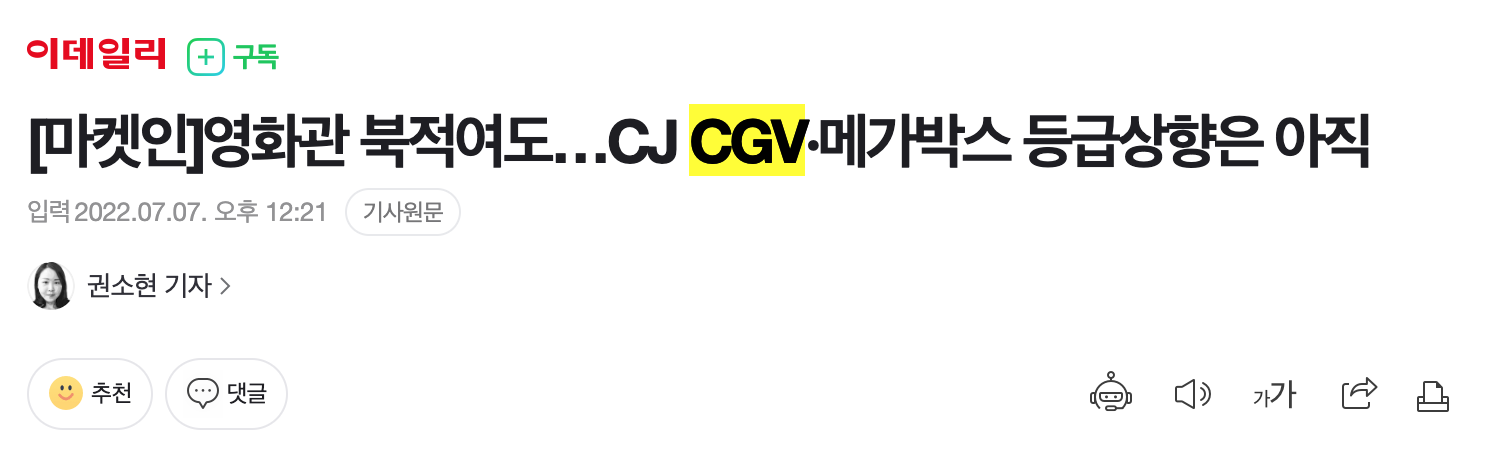 이러한 이유를 종합했을대 CJ CGV 종목 또한 외계+인 개봉과 같은 단기 호재성 이슈매매로 접근하는게 좋아보인다.