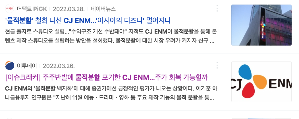 CJ ENM 주가는 러우전쟁과 금리인상과 같은 매크로 이슈와 함께 물적분할 이슈로 크게 하락하여 PBR 기준 역사적 하단에 있어 투자하기 매력적인 구간이라 생각되나 CJ 자회사, 계열사들은 주주 비친화적이고 언제든 물적분할을 재개할수 있다고 판단돼 외계+인 개봉과 같은 단기 호재성 이슈매매로 접근하는게 좋아보인다.
