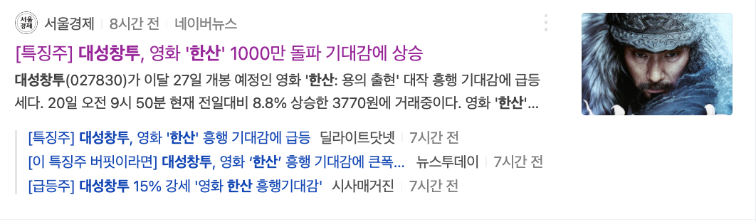 대성창투가 한산 용의출현 관련주와 수혜주로 분류되는 이유는 지난 2014년 '명량'에 투자해 주가가 급등한 적이 있으며 이번에 '한산'에도 투자한 것으로 알려졌다.