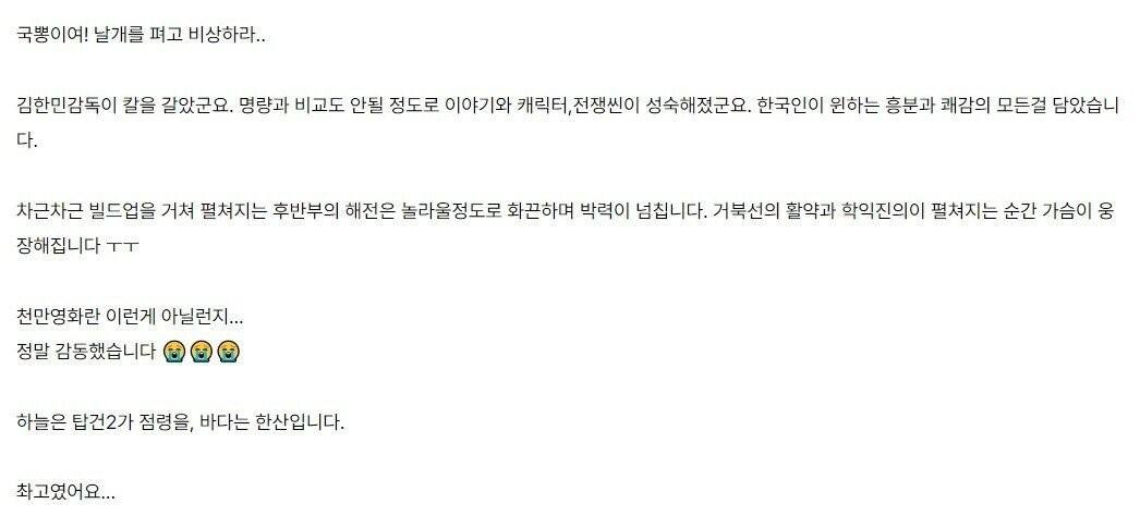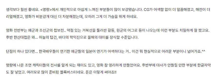 19일 열린 블라인드 시사회 후기를 보면 하늘은 탑건2가 점령 바다는 한산이라는 표현이 나올만큼 '한산' 영화의 전투씬이 웅장하고 시각특수효과(VFX)가 뛰어나 명량보다 낫다는 의견이 쏟아지고 있다.