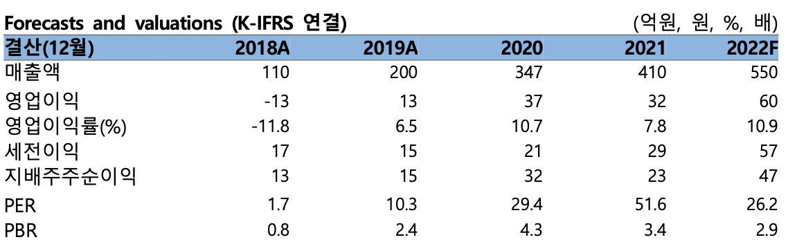 현재 주가는 22년 PER 26.2배 수준으로 밸류에이션 매력이 크지는 않으나 올해 2분기 실적을 저점으로 하반기부터 내년까지 실적 성장 추세가 이어질 수 있다는 점이 긍정적이다.