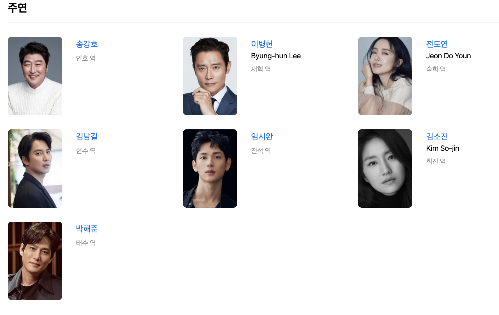 송강호 - 인호 역 // 이병헌 - 재혁 역 // 전도연 - 숙희 역