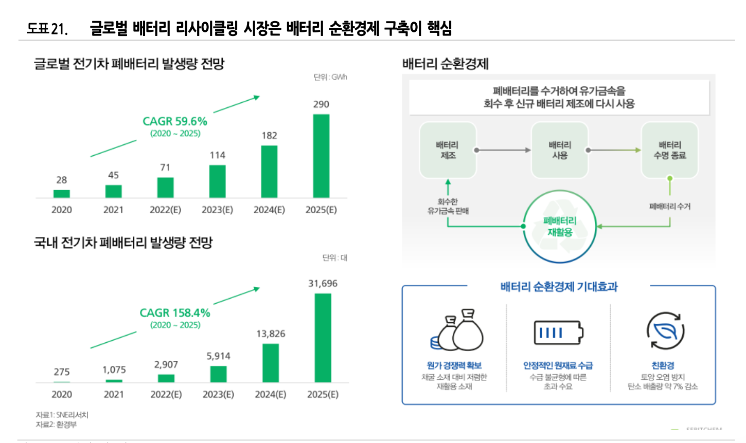 글로벌 및 국내 전기차 폐배터리 발생량이 연평균(2020~2025) 각각 59.6%, 158.4% 증가하고 있는 가운데, 새빗켐의 전구 체복합액 리사이클링 시장에서 안정적인 성장을 지속할 것으로 전망함.