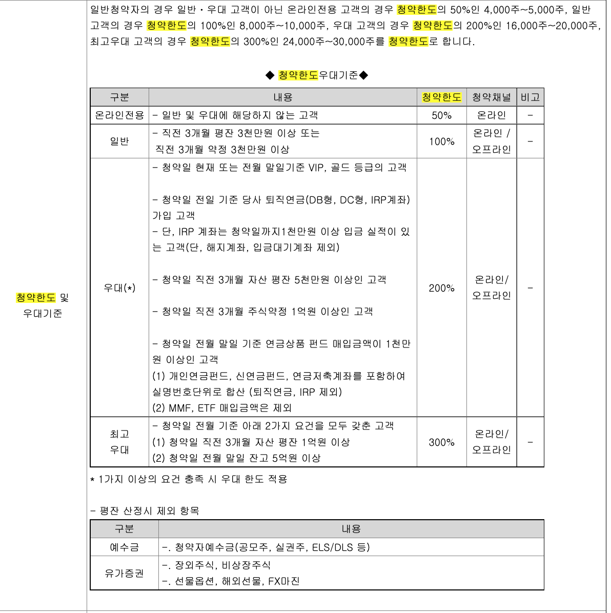 최고 우대 고객의 경우 24,000주 ~ 30,000주까지 청약이 가능하고 , 온라인 전용 고객의 경우 4,000주 ~ 5,000주 까지 청약 가능하다.