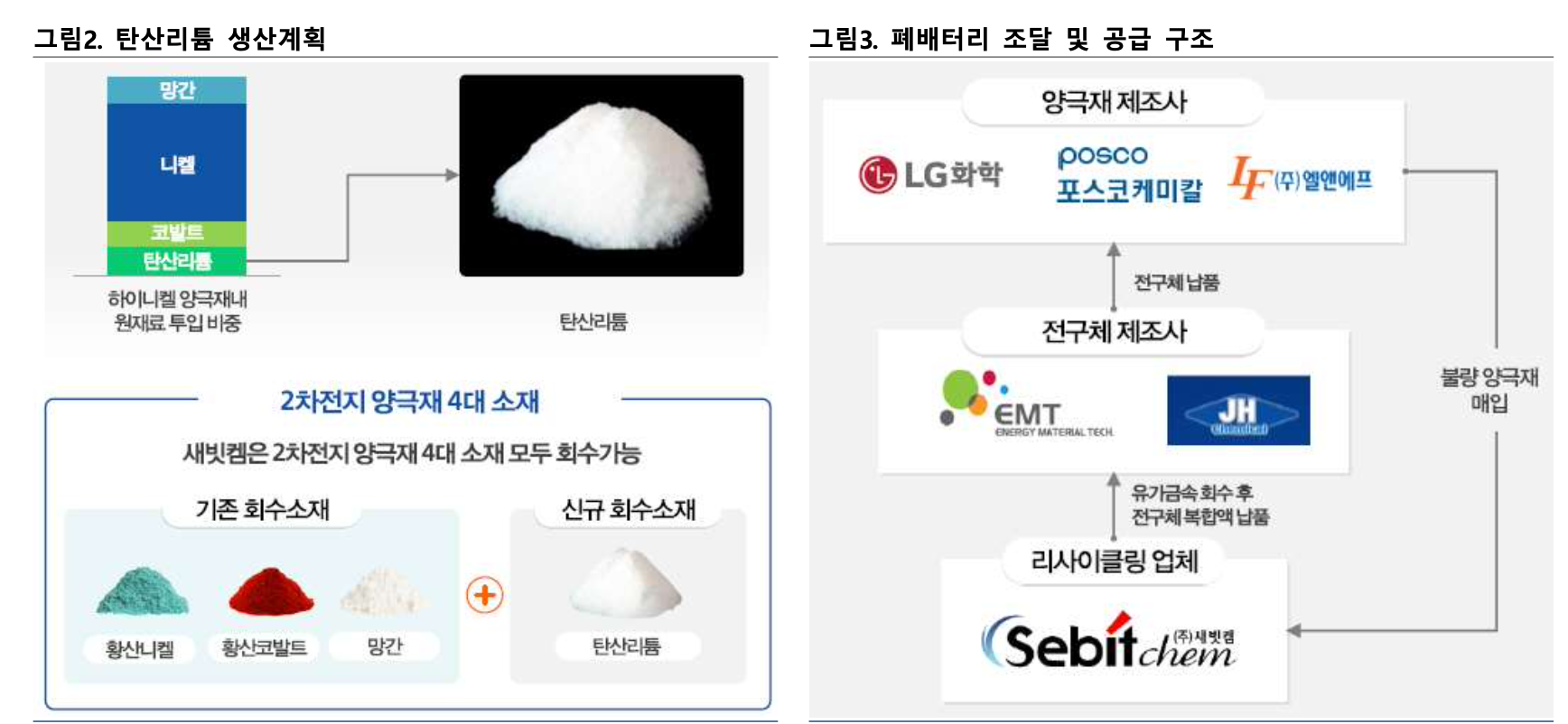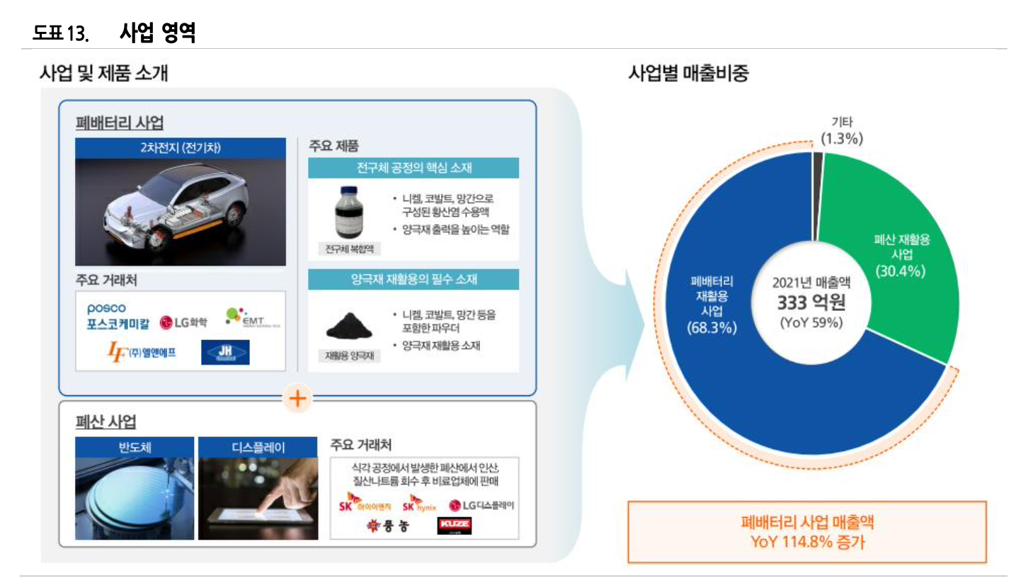 ② LG화학, 포스코케미칼, 엘앤에프 등으로부터 불량 양극재를 매입, 유가금속을 회수 후 이엠티나 JH 케미칼을 통해 고객에게 납품함.2017년 진출 이후 매출이 급성장하고 있음.